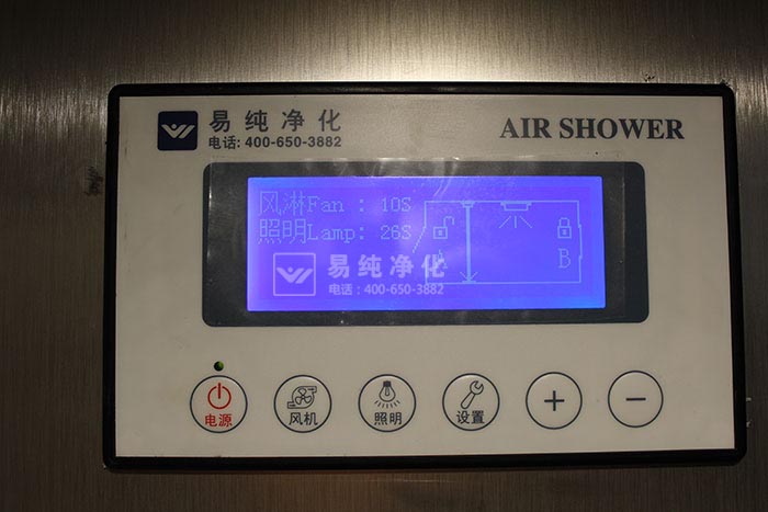 (七)風淋控制面板為液晶藍屏顯示,且帶有屏幕保護,易純凈化出廠的風淋室控制面板解鎖辦法只需要連續按“—,+,照明"三鍵,聽見”滴滴"兩聲后,可進行風淋時間,照明時間,屏保時間設置即可。