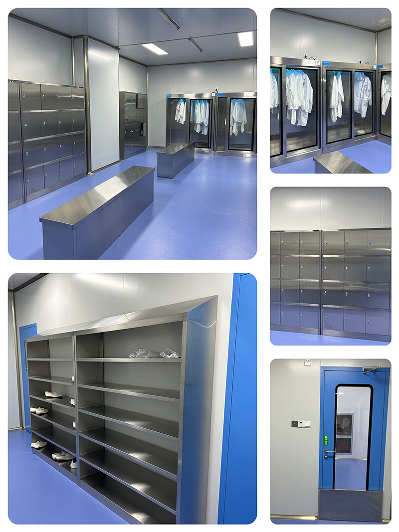 更衣室入口設置門禁和擋鼠板,內(nèi)部不銹鋼鞋柜和衣柜,二更內(nèi)配紫外線消毒衣柜